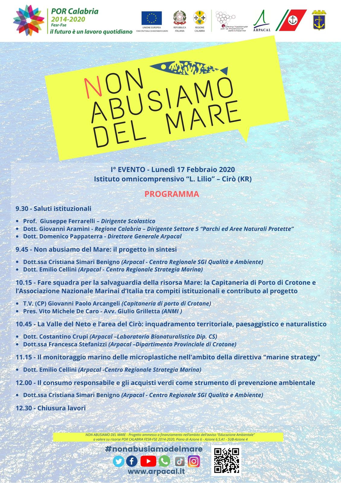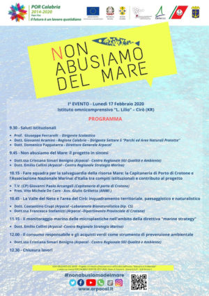 Dopo un approfondito dialogo con i soggetti partner e con le scuole del territorio, è giunto il momento di dare il via a “Non Abusiamo del Mare“, progetto di educazione ambientale dell’Arpacal ammesso al finanziamento nell’ambito dell’avviso pubblico “Educazione Ambientale” che ha selezionato i 16 progetti vincitori a valere su risorse POR CALABRIA FESR-FSE 2014-2020, Piano di Azione 6 – Azione 6.5.A1 – SUB-Azione 4″.