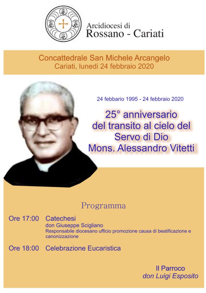 Carissimi, in occasione del 25° anniversario del transito al cielo del Servo di Dio Alessandro Vitetti (1995-2020), lunedì 24 febbraio c.a., nella Chiesa Concattedrale di San Michele Arcangelo in Cariati, ci sarà un momento di catechesi tenuta da don Giuseppe Scigliano.