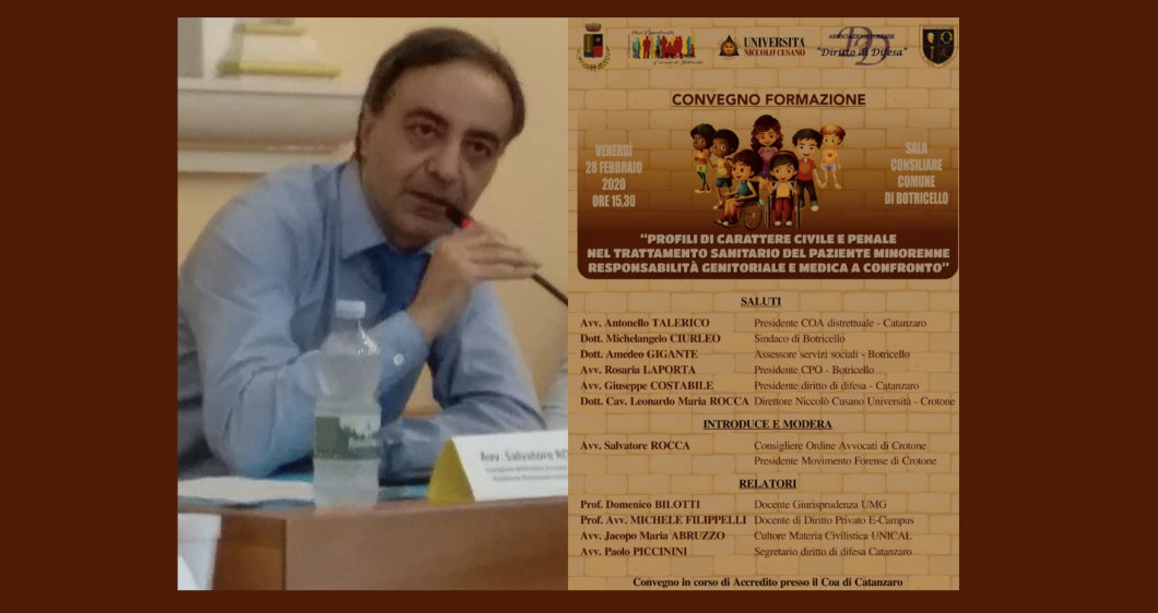 Si terrà Venerdì 28 febbraio a Botricello (CZ) alle ore 15:30 nella Sala Consiliare. Il convegno è stato accreditato dal COA di Catanzaro con 3 crediti formativi, sarà moderato dall’avv. Salvatore Rocca, membro del Consiglio dell’Ordine degli Avvocati di Crotone e Presidente del Movimento Forense di Crotone e prevede gli interventi dell’avv. Antonello Talerico, presidente del Consiglio dell’Ordine degli Avvocati di Catanzaro, del dottor Michelangelo Curleo, sindaco del comune di Botricello, dell’assessore Amedeo Gigante, dell’avv. Rosaria Laporta, presidente del CPO Botricello, dell’avv. Giuseppe Costabile, presidente di Diritto di Difesa, e del Cavalier Leonardo Maria Rocca, direttore dell’università Niccolò Cusano di Crotone. Relazioneranno l’avv. Jacopo Maria Abruzzo, il professor avv. Michele Filippelli, privatista dell’E-Campus telematico, il professor Domenico Bilotti dell’Università Magna Graecia di Catanzaro – Dipartimento di Giurisprudenza, Economia e Sociologia, nonchè l’avv. Paolo Piccinini.