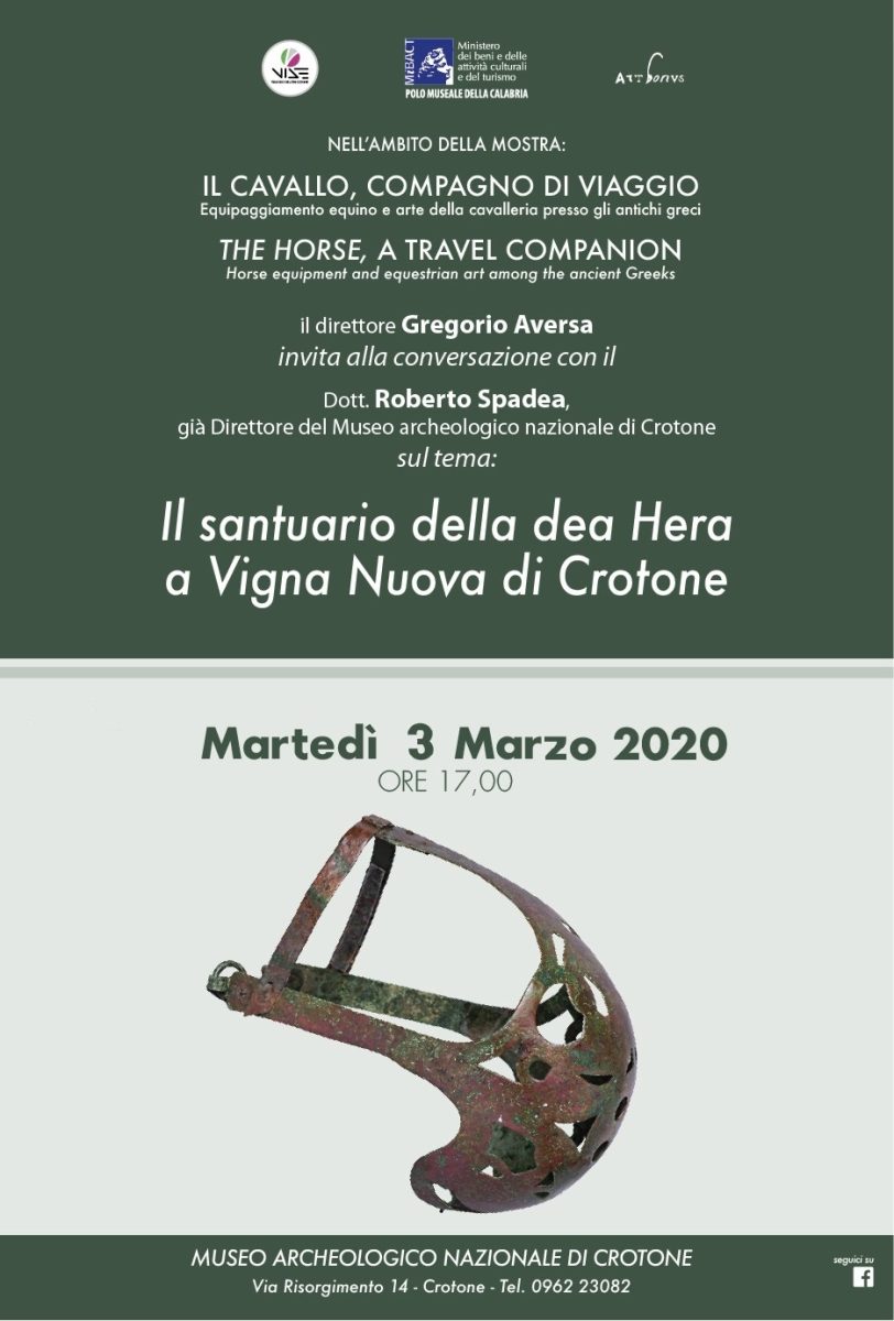 Martedì 3 marzo 2020, alle ore 17.00, a Crotone, presso il Museo Archeologico Nazionale di Crotone, diretto dal dottor Gregorio Aversa, afferente al Polo museale della Calabria, guidato dalla dottoressa Antonella Cucciniello, nell’ambito della mostra Il cavallo, compagno di viaggio. Equipaggiamento equino e arte della cavalleria presso gli antichi greci, si terrà una conversazione sul tema Il santuario della dea Hera a Vigna Nuova di Crotone.