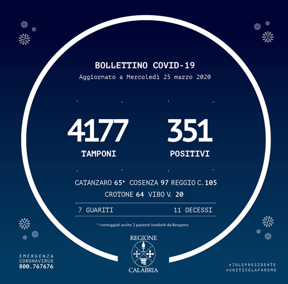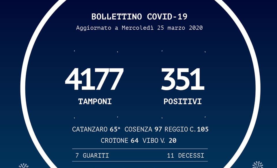 In Calabria ad oggi sono stati effettuati 4177 tamponi. Le persone risultate positive al Coronavirus sono 351 (+32 rispetto a ieri), quelle negative sono 3826.