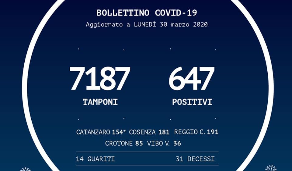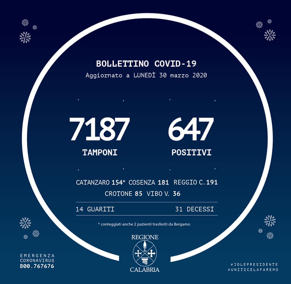 Nel conteggio sono compresi anche i due pazienti di Bergamo trasferiti a Catanzaro, mentre non sono compresi i numeri del contagio pervenuti dopo la comunicazione dei dati alla Protezione Civile Nazionale.