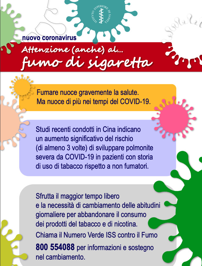 Per mettere in guardia i fumatori, l’Istituto Superiore di sanità ha realizzato un poster ad hoc con informazioni sui rischi che corrono di sviluppare forme gravi di Covid-19: secondo studi recenti condotti in Cina, segnala il poster, vi sarebbe un aumento significativo del rischio (di almeno 3 volte) di sviluppare polmonite severa da COVID-19 in pazienti con storia di uso di tabacco rispetto a non fumatori.