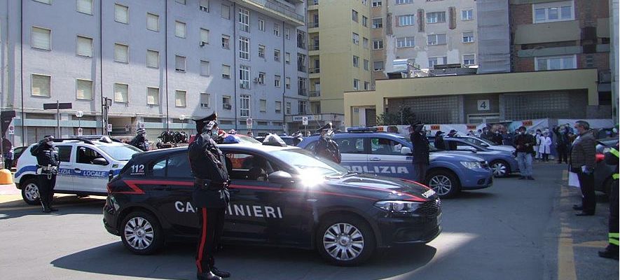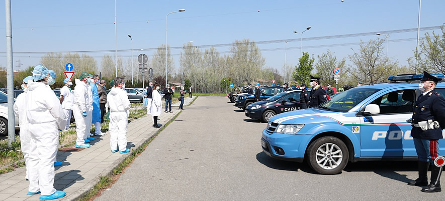 Pattuglie della Polizia e della Stradale, dei Carabinieri Stato e dei loro Forestali, della Guardia di Finanza con i Baschi verdi, della Polizia penitenziaria, insieme a operatori dei Vigili del fuoco, delle Polizie locali e di quella provinciale, militari e operatori e volontari del sistema di protezione civile si sono presentati alle 12 davanti al policlinico per spostarsi 15 minuti dopo davanti all’ospedale civile, prima suonando le sirene, subito dopo osservando un minuto di silenzio in memoria delle vittime dell’epidemia.