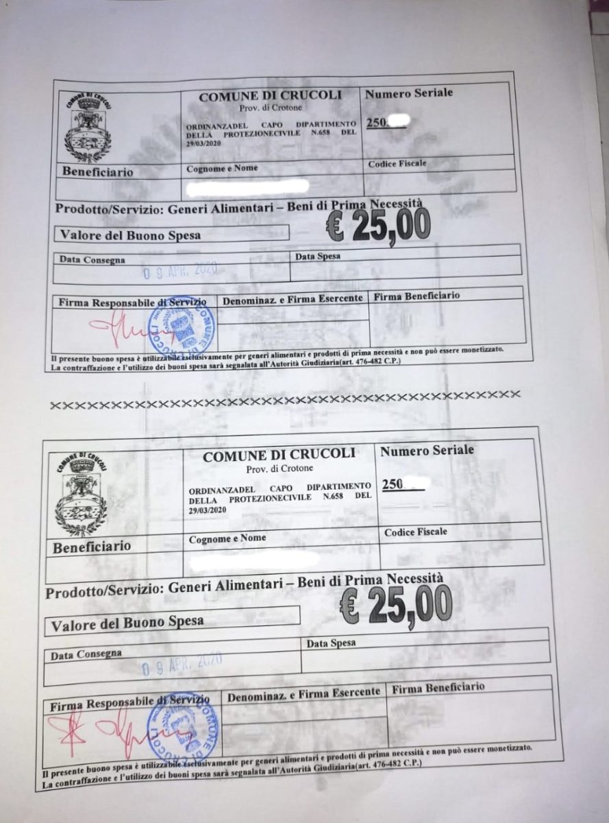 Sono state un centinaio le richieste ammesse ad usufruire dei Buoni Spesa della Protezione Civile su un totale di 128 presentate al Comune di Crucoli.