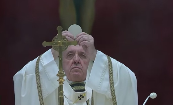 La celebrazione si sviluppa, in una Basilica Vaticana semivuota, dalla suggestiva liturgia detta del “lucernario”, che apre solennemente la Veglia, con la benedizione del fuoco nuovo, l’accensione del cero pasquale e, mentre il tempio si illumina al canto “Lumen Christi”, la processione verso l’altare della Cattedra. Davanti ad un drappo rosso svetta il crocifisso di San Marcello al Corso, accanto all’icona di Maria Salus Populi Romani. Due immagini che accompagnano tutte le celebrazioni del Tempo di Pasqua in Vaticano. Il “lucernario” si chiude con il canto dell’Exsultet, l’annunzio pasquale, in latino, intonato dal diacono.