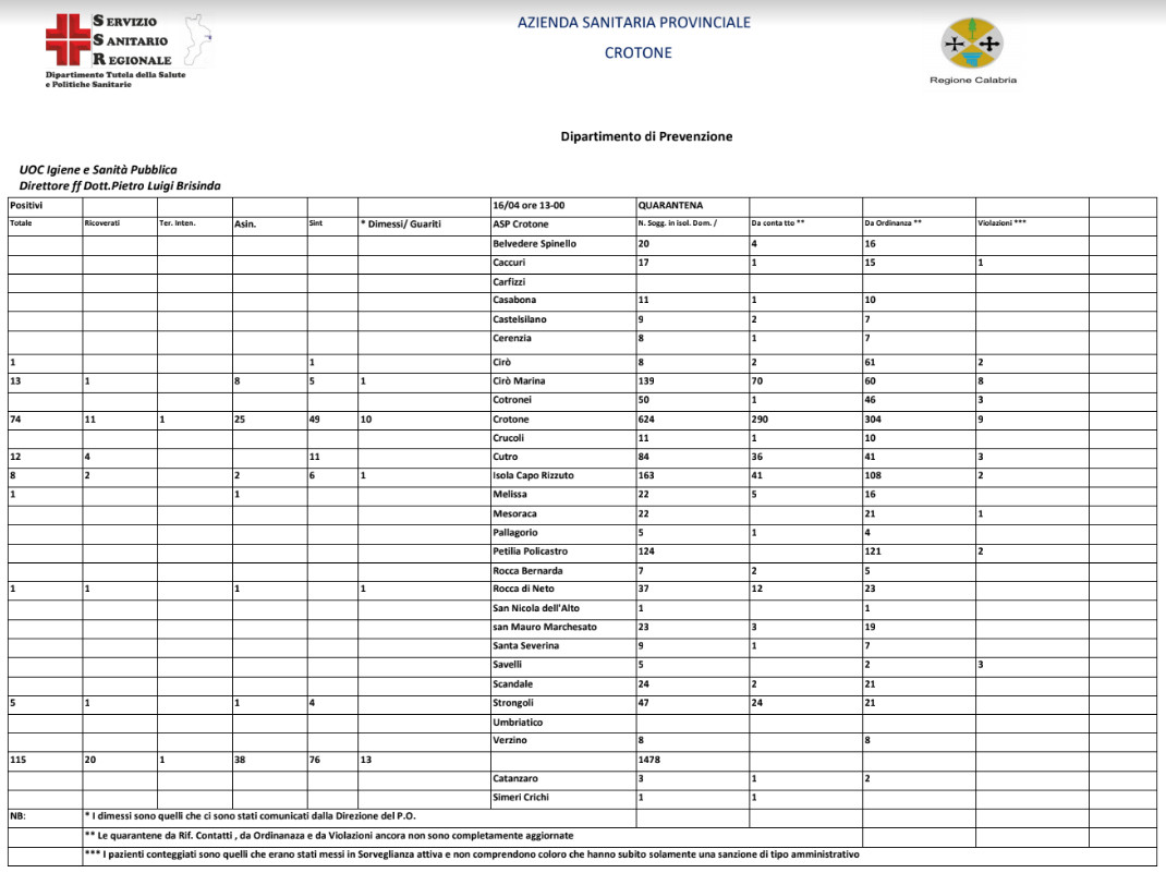 Ad oggi nella provincia di Crotone risultano 115 casi complessivi di infezione da coronavirus, dei quali 20 ricoverati all’Ospedale San Giovanni di Dio di Crotone, 1 in terapia intensiva, 38 asintomatici, 76 con sintomi e 1478 in isolamento domiciliare.