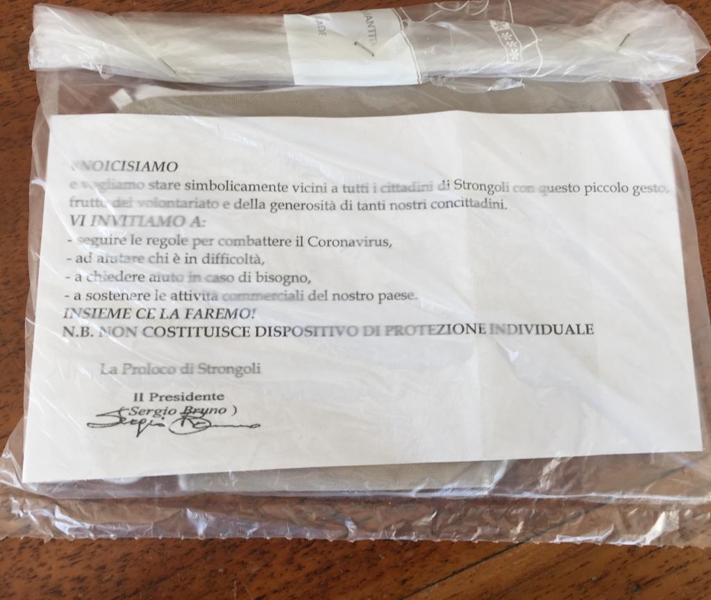 Con la consegna della mascherina e del libro è stata consegnata anche una lettera a firma del Presidente Sergio Bruno : “ Noi ci siamo; e vogliamo stare simbolicamente vicini a tutti i cittadini di Strongoli, con questo piccolo gesto, frutto del volontariato e della generosità di tanti nostri concittadini. Vi invitiamo a : seguire le regole per combattere il Corona Virus, ad aiutare chi è in difficoltà, a chiedere aiuto in caso di bisogno, a sostenete le attività commerciali della nostra Città. Insieme ce la faremo. “La Pro Loco – si legge – avvisa che il dispositivo che verrà donato alla popolazione strongolese non può essere considerato dispositivo di sicurezza individuale”.