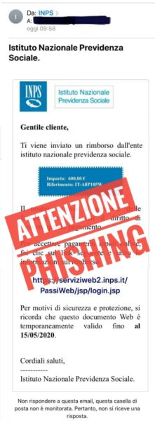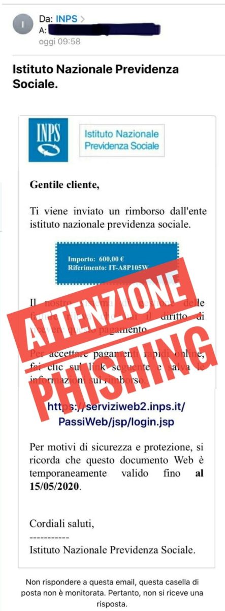 Si invitano tutti gli utenti a ignorare email che propongono di cliccare su un link per ottenere il pagamento del Bonus 600 euro o qualsiasi forma di rimborso da parte dell’Inps.