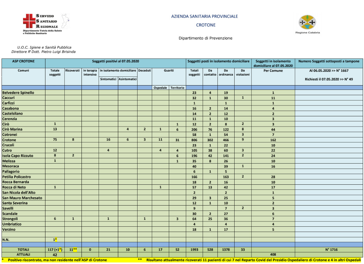 Ad oggi nella provincia di Crotone risultano 118 casi complessivi di infezione da coronavirus, 42 attuali positivi, 11 ricoverati dei quali 7 ricoverati all’Ospedale San Giovanni di Dio di Crotone e 4 in altri ospedali, 0 in terapia intensiva, 21 sintomatici, 10 asintomatici, 6 deceduti, 69 guariti e 1993 in quarantena domiciliare.
