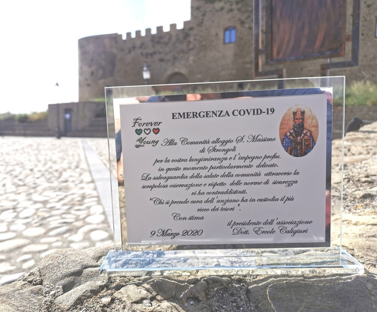 Per tale ragione l’Associazione Forever Young di Strongoli, rappresentata dal presidente Ercole Caligiuri, ha consegnato una targa di riconoscimento per la serietà ancor più manifesta in momento tanto particolare quanto imprevedibile.“Ringrazio Antonio, Caterina, Pina e Lina i quali da anni coordinano in maniera impeccabile quello che rappresenta il fiore all’occhiello della comunità strongolese; con grandi capacità organizzative e in maniera preventiva hanno limitato e controllato gli spostamenti degli operatori e vietato ogni ingresso da parte di esterni , mantenendo un servizio eccellente in emergenza covid-19”. “Il mio augurio, continua Caligiuri, facendosi portavoce di tutta l’associazione, è quello di continuare a renderci orgogliosi di questa piccola comunità ubicata nei locali del Notaio Carlo Perri molto affezionato al paese di origine”.“Ringrazio inoltre, conclude Caligiuri , gli operatori che quotidianamente con professionalità , svolgono al meglio il proprio lavoro :Maria Scalise , Maria Covaleo , Annamaria Mittica , Angela Laturraca , Gisella Zito , Gianna Zito , Tina Battaglia , Caterina Fiorita”.