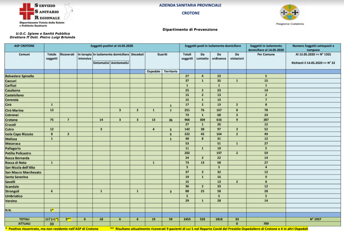 Ad oggi, 14 maggio nella provincia di Crotone risultano 117 casi complessivi di infezione da coronavirus, 33 attuali positivi (-4), 9 ricoverati dei quali 5 ricoverati all’Ospedale San Giovanni di Dio di Crotone e 4 in altri ospedali, 0 in terapia intensiva, 18 sintomatici, 6 asintomatici, 6 deceduti, 78 guariti e 2455 in quarantena domiciliare (+71).