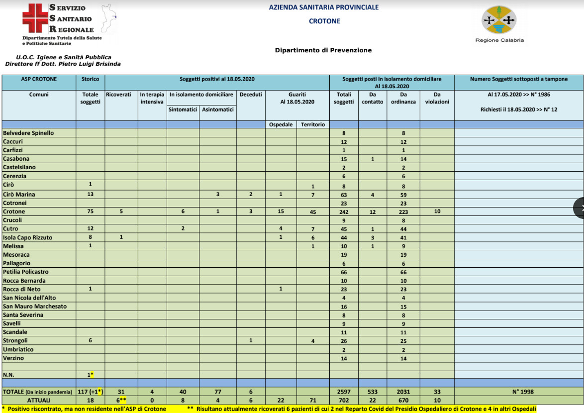 Ad oggi, 18 maggio nella provincia di Crotone risultano 118 casi complessivi di infezione da coronavirus, 24 attuali positivi, 6 ricoverati dei quali 2 ricoverati all’Ospedale San Giovanni di Dio di Crotone (-1) e 4 in altri ospedali, 0 in terapia intensiva, 8 sintomatici (-4), 4 asintomatici (-1), 6 deceduti, 93 guariti (+6) e 702 in quarantena domiciliare (-106).