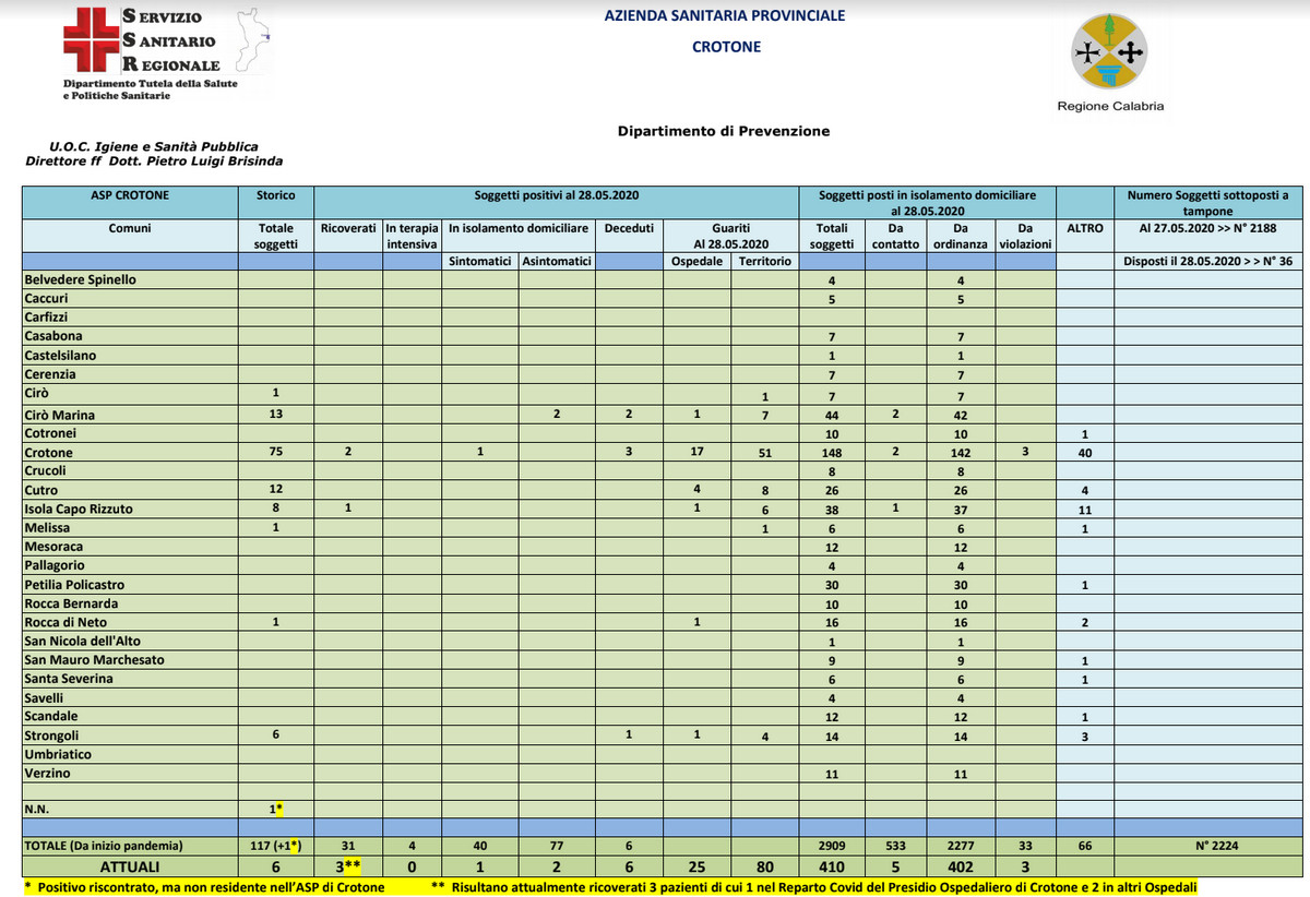 Ad oggi, 28 maggio nella provincia di Crotone risultano 117 casi complessivi di infezione da coronavirus, 6 attuali positivi, 3 ricoverati dei quali 1 ricoverato all’Ospedale San Giovanni di Dio di Crotone e 2 in altri ospedali, 0 in terapia intensiva, 1 sintomatico, 2 asintomatici, 6 deceduti, 105 guariti e 410 in quarantena domiciliare (-30).