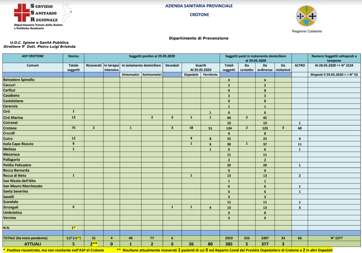 Ad oggi, 29 maggio nella provincia di Crotone risultano 117 casi complessivi di infezione da coronavirus, 5 attuali positivi (-1), 2 ricoverati dei quali 0 ricoverati all’Ospedale San Giovanni di Dio di Crotone e 2 in altri ospedali, 0 in terapia intensiva, 1 sintomatico, 2 asintomatici, 6 deceduti, 106 guariti e 385 in quarantena domiciliare (-25).