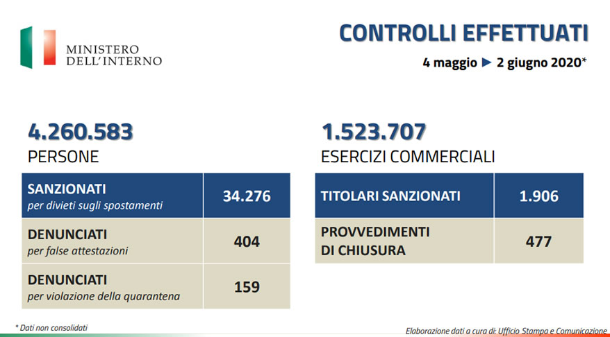 Nella fase 2, tra il 4 maggio e il 2 giugno 2020, sono stati effettuati 4.260.583 controlli sulle persone e 1.523.707 sugli esercizi commerciali o attività.