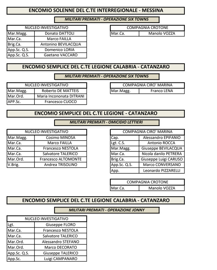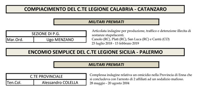 Elenco dei militari premiati nell’odierna festa dell’Arma dei Carbinieri, nel corso della cerimonia tenutasi presso questo Comando Provinciale.