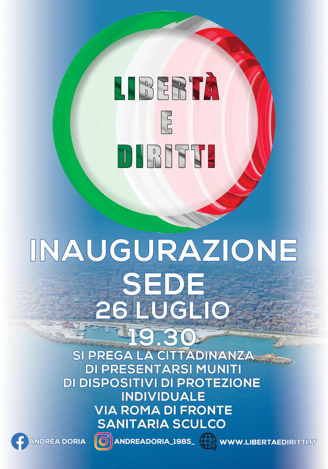Domenica 26 luglio 2020 alle 19:30 si terrà l’inagurazione della sede elettorale sita in Via Roma (di fronte la sanitaria Sculco) e la presentazione del progetto politico di Libertà e Diritti.