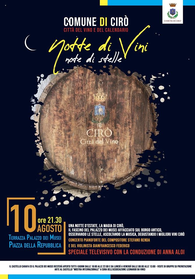Una notte d’estate, la magia di Cirò, il fascino del Palazzo dei Musei affacciato sul borgo antico, osservando le stelle, ascoltando buona musica, degustando i migliori vini Cirò.