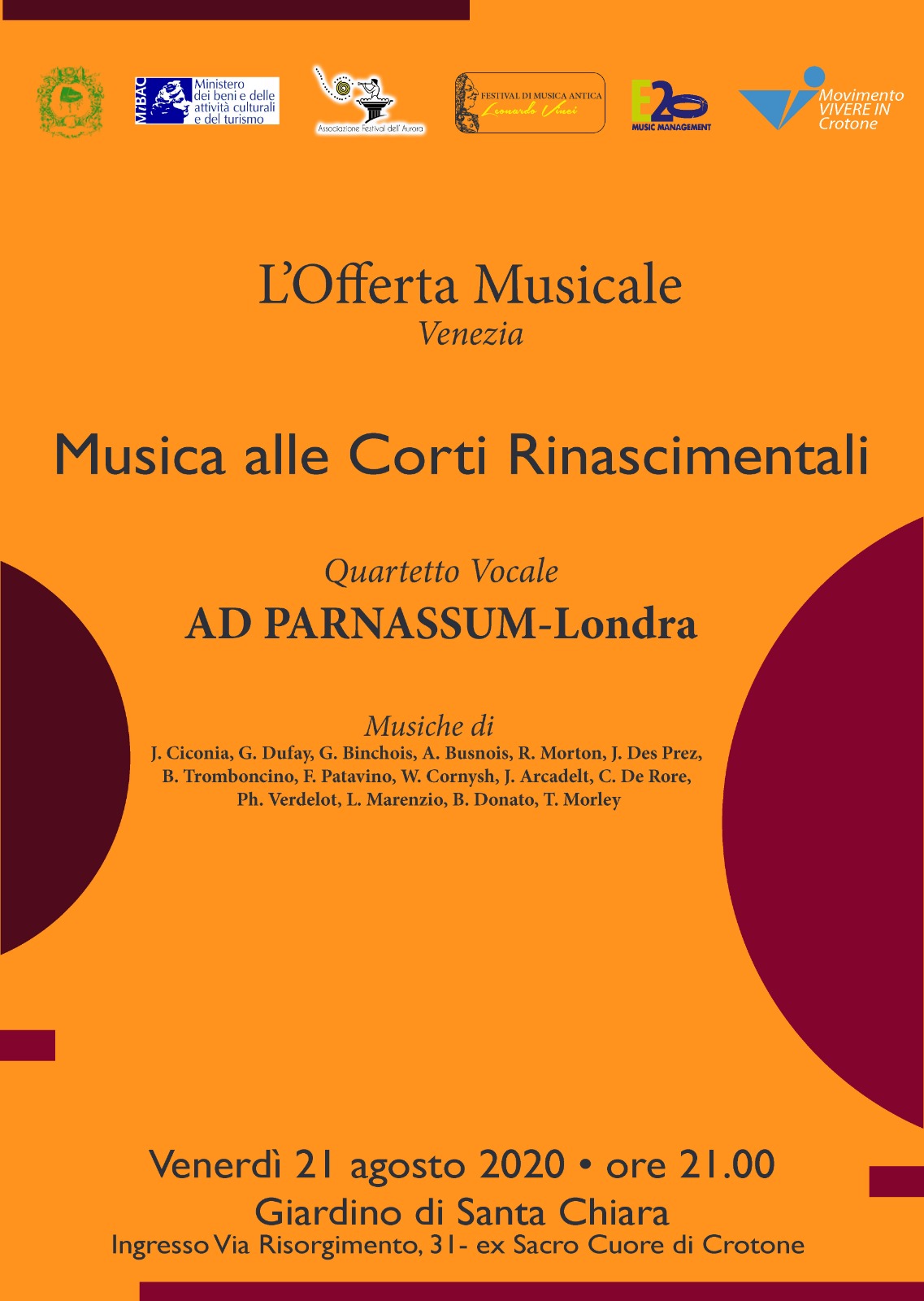 Farà tappa anche a Crotone la tournée estiva del quartetto musicale Ad Parnassum – Londra, giovane Compagnia inglese impegnata da qualche settimana in una serie di concerti nel Sud Italia. Il concerto polifonico, dal titolo Musica alle Corti Rinascimentali, è curato da L’Offerta Musicale Venezia, fondata e diretta dal M° Riccardo Parravicini, e ospitato dall’associazione crotonese E20 Music Management, venerdì 21 agosto alle ore 21.00 presso il giardino di Santa Chiara, accessibile da via Risorgimento 31 (ex Sacro Cuore).