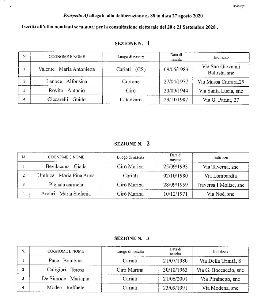 Ecco i nomi degli Scrutatori per le elezioni e referendum per domenica 20 e lunedi 21 settembre 2020. In totale sono 56 gli Scrutatori scelti per le 14 sezioni e 56 sostituti.
