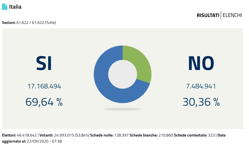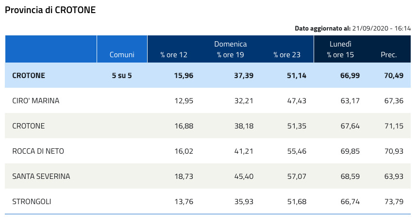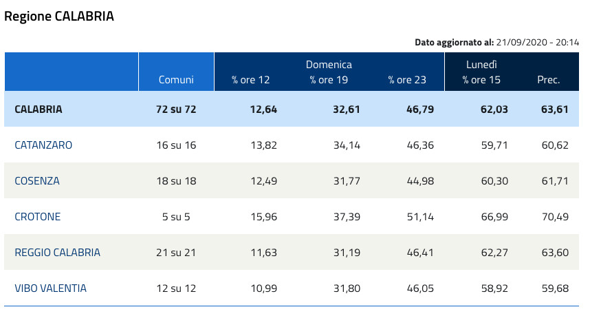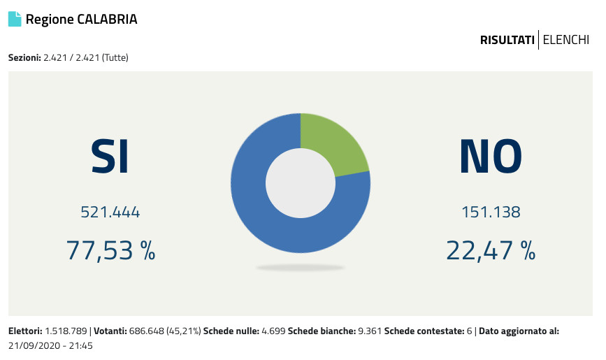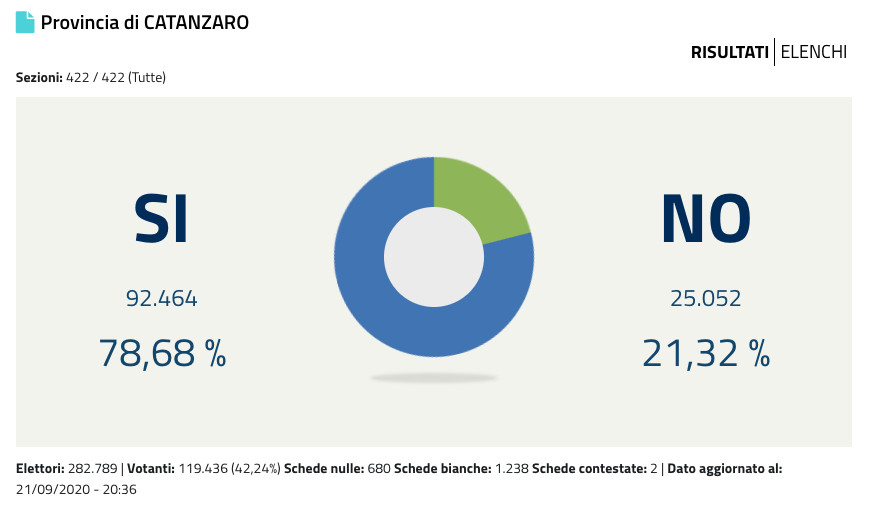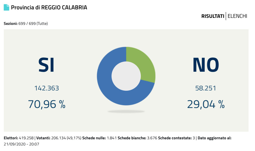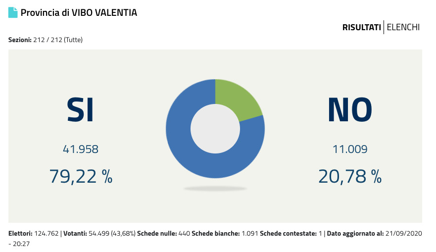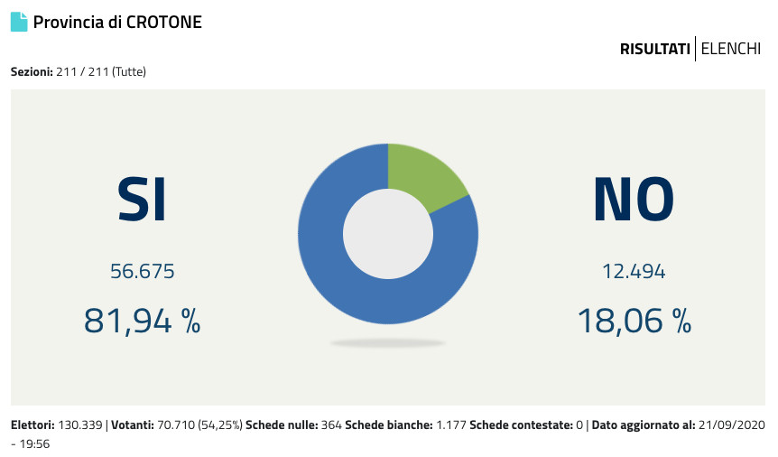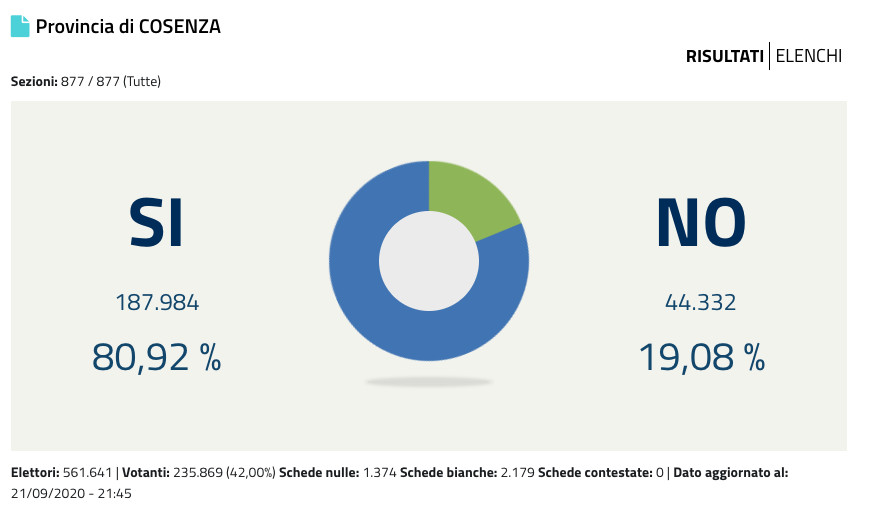 Per il quesito sul taglio dei parlamentari, la provincia in cui la presenza alle urne è stata più alta è quella di Crotone con il 54,25% degli aventi diritto, seguita da Reggio Calabria con il 49,16%, Vibo Valentia (43,23), Catanzaro (42,24) e Cosenza (42,02).