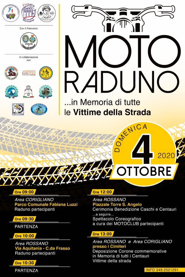 La Città di Corigliano-Rossano onorerà tutti i centauri caduti sulla strada. L’appuntamento è fissato in agenda per domenica 4 ottobre. In programma il primo Motoraduno in Memoria di Tutti i Centauri vittime delle strada. Obiettivo degli organizzatori è l’istituzionalizzazione della manifestazione commemorativa.