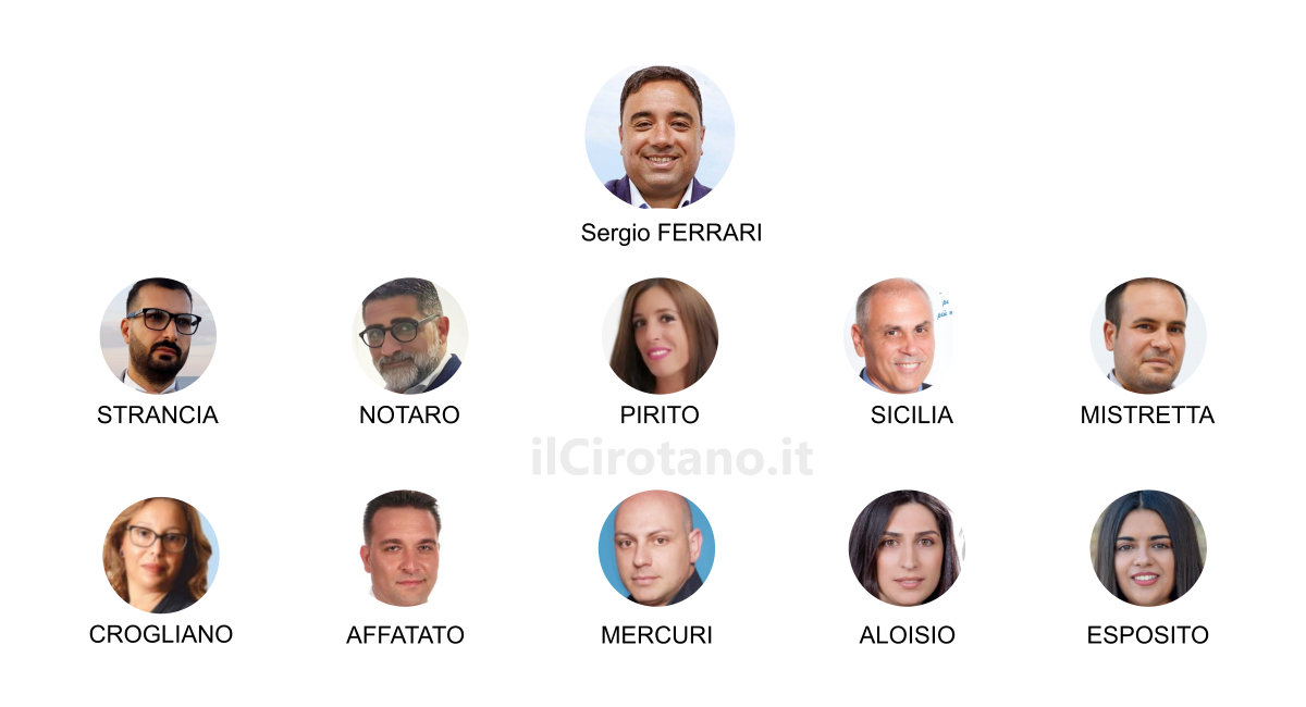 La maggioranza è formata da 10 consiglieri, molti alla prima esperienza, della lista “Civica per Cirò Marina”, Giuseppe Strancia, Gianni Notaro, Giusi Pirito e Cataldo Sicilia; lista “Sergio Ferrari Sindaco”, Andrea Mistretta, Vincenza Crogliano e Francesco Affatato; lista “Con il Cuore per Cirò Marina”, Piero Mercuri, Francesca Aloisio e Maria Esposito.