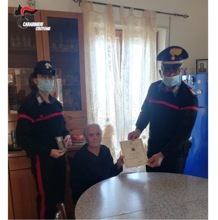 I Carabinieri della locale Stazione hanno notificato alla moglie del Soldato Esposito Luigi, classe 1922 e deceduto a Torretta di Crucoli nel 1983, l’attestato di conferimento della Medaglia Commemorativa di campagna di guerra 1940-43, con annessa insegna metallica e lettera di compiacimento, trasmessi dal Comando Militare Esercito “Calabria” di Catanzaro.