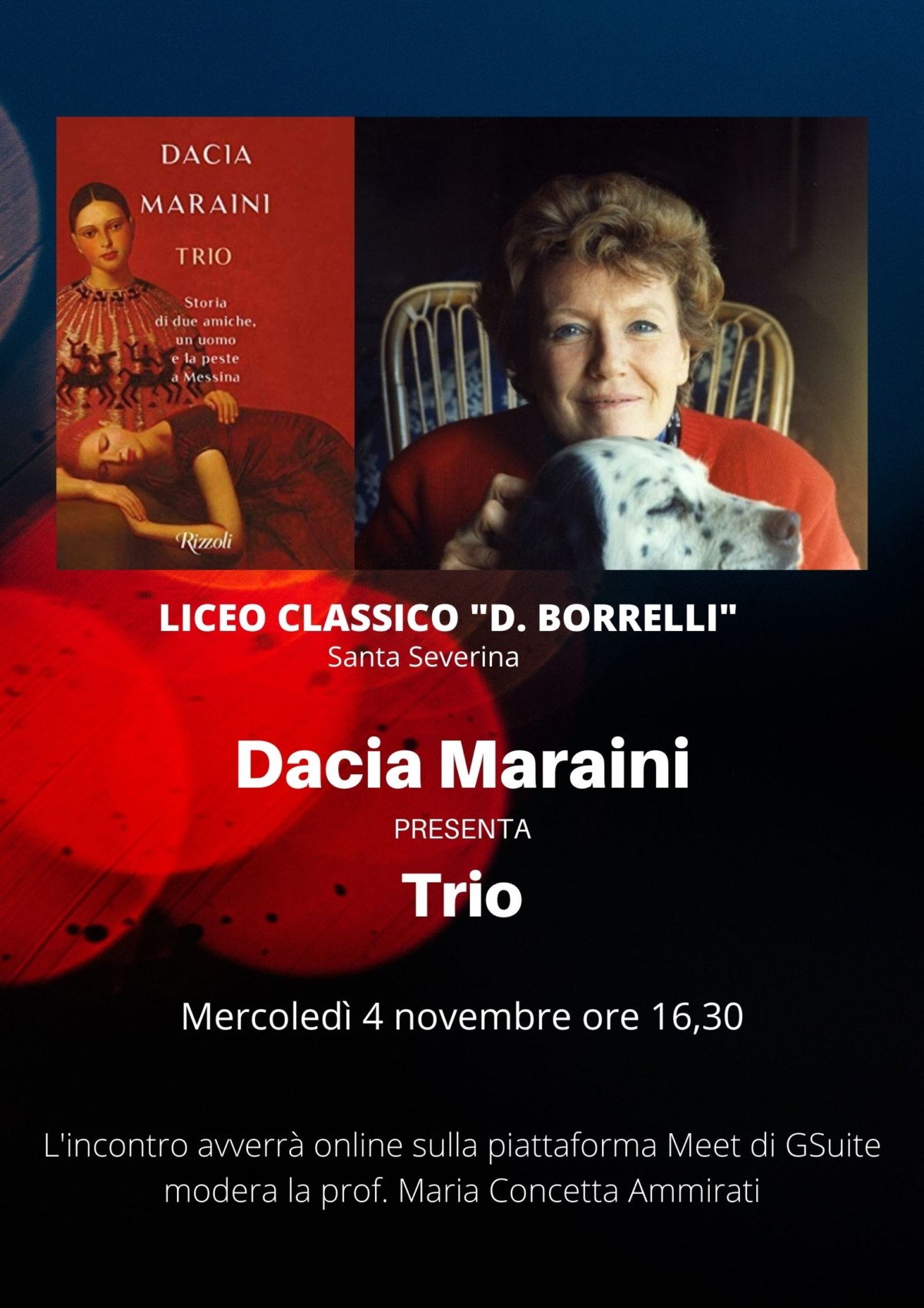 S’intitola Trio ed è la sua ultima fatica letteraria, il romanzo che la scrittrice Dacia Maraini, autrice di romanzi, racconti, opere teatrali, poesie e saggi, tradotti in oltre venti paesi, presenterà agli studenti del Liceo Classico “D. Borrelli” di Santa Severinail 4 novembre prossimo. L’incontro, fortemente voluto dalla Dirigente Scolastica Antonietta Ferrazzo, si terrà online, sulla piattaforma Meet di GSuite, per non contravvenire alle norme anti Covid19 e sarà moderato dalla prof.ssa Maria Concetta Ammirati.
