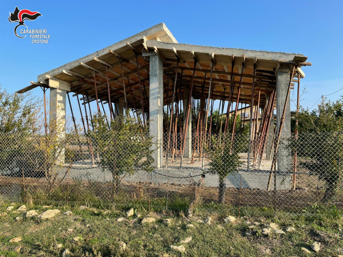 Nel corso di un servizio di controllo del territorio i militari della stazione CC Forestale Crotone hanno notato un fabbricato in costruzione in conglomerato cementizio armato, di recentissima esecuzione, privo della segnaletica prevista per i cantieri edili. In seguito ad accertamenti effettuati presso l’ufficio tecnico comunale è emerso che l’opera, avente uno sviluppo in pianta di circa 7 m x 10 m, era priva di titoli abilitativi legittimanti l’edificazione. È stata così posta sotto sequestro per bloccarne il proseguimento della condotta illegale.