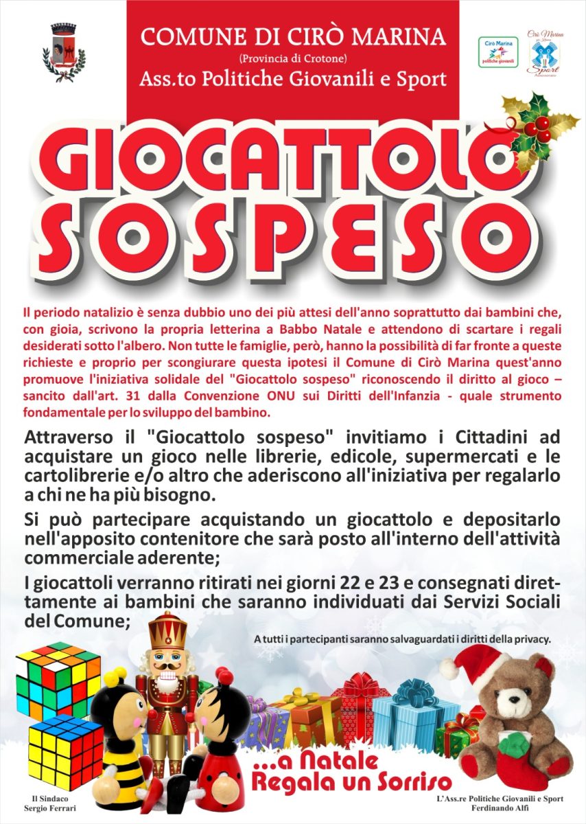 “Siamo particolarmente felici di proporre il “Giocattolo Sospeso”, – dichiara Ferdinando Alfì Assessore allo Sport e Politiche Giovanili del Comune di Cirò Marina – In questo periodo in cui il Covid ha limitato e condizionato la nostra vita.