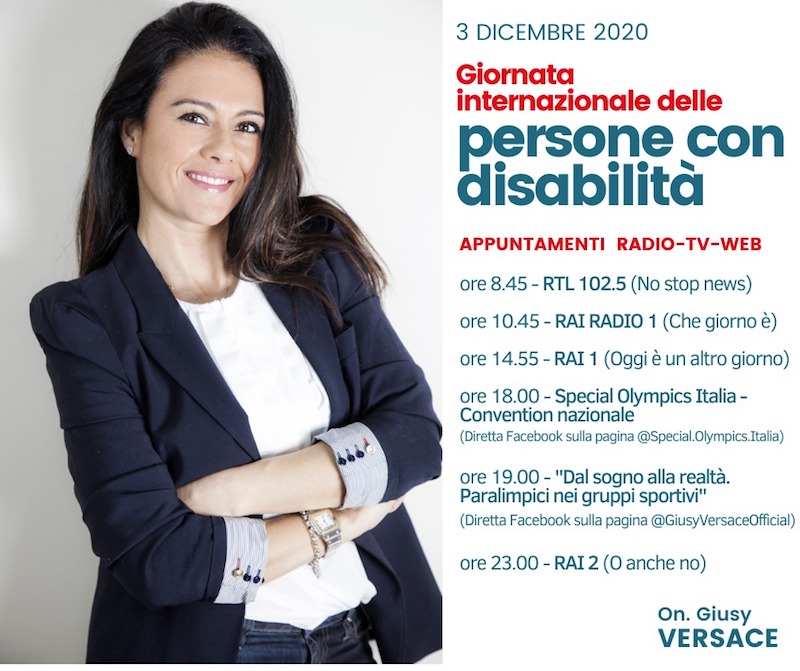 Oltre a questo appuntamento, oggi la Versace sarà anche ospite in molti spazi radiofonici, televisivi e dirette sui social, per parlare di questa importante giornata istituita nel 1981 dallAssemblea generale dellONU per promuovere linclusione delle persone con disabilità e combattere ogni forma di discriminazione.