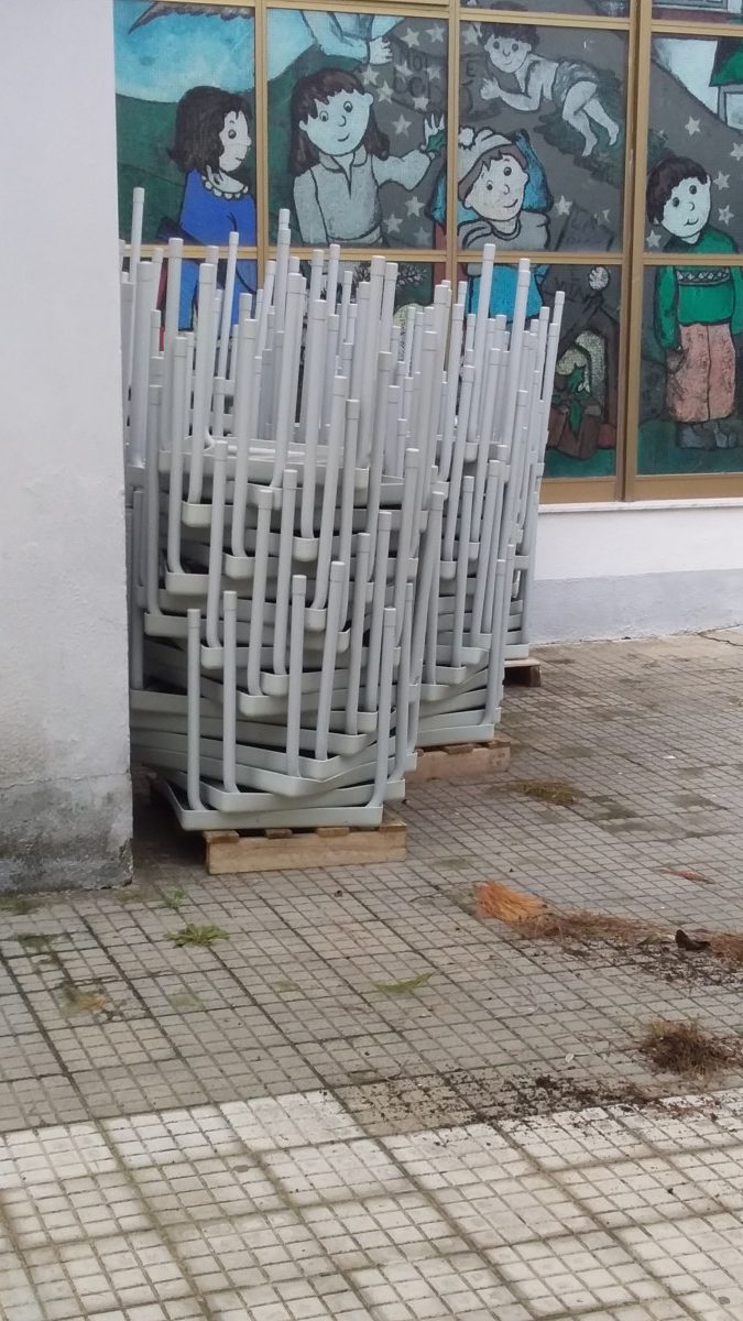Inoltre sempre nel cortile, ci sino diversi banchi e sedie rotte ed altri materiali che giacciono nell’abbondano più totale.
