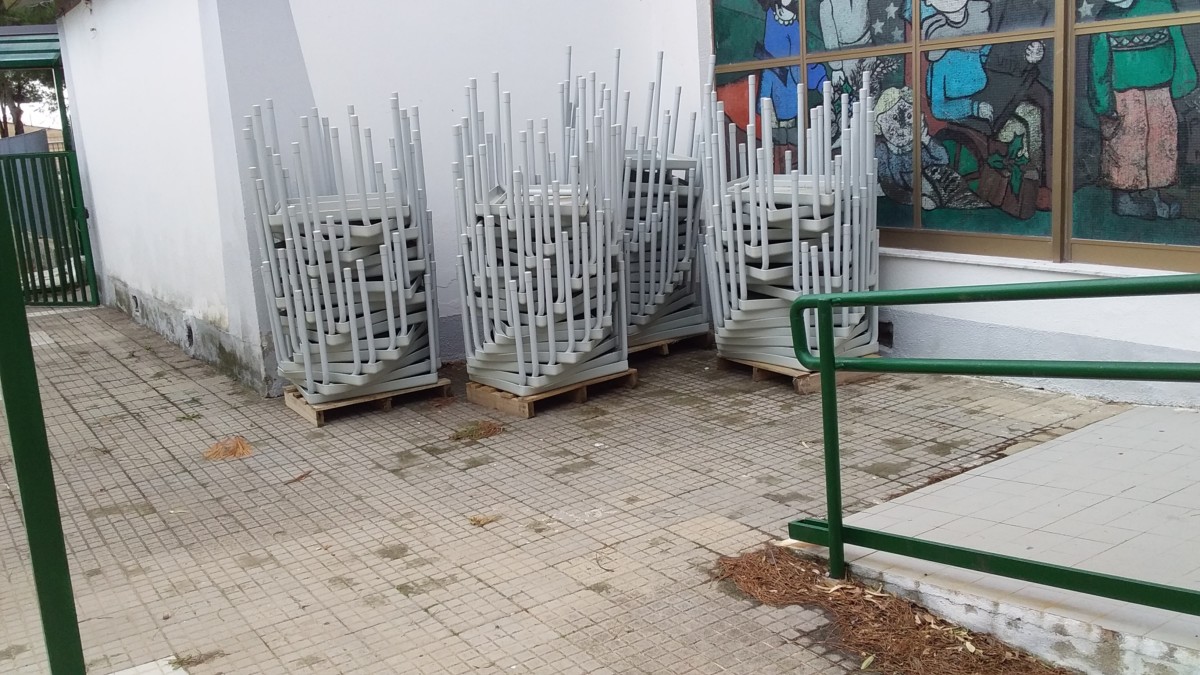 All’interno del cortile scolastico ci sono arredi nuovi incustoditi lasciati alle intemperie metereologiche.