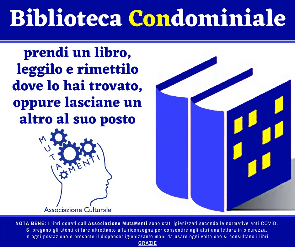 I libri donati dall’associazione MutaMenti sono stati igienizzati secondo le normative anti COVID. Sulla free library è, inoltre, presente il dispenser igienizzante mani da usare ogni volta che si consultano i libri.