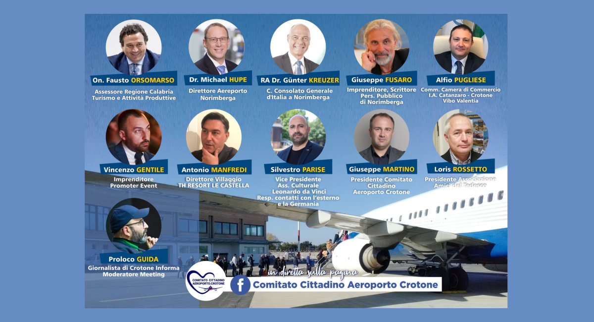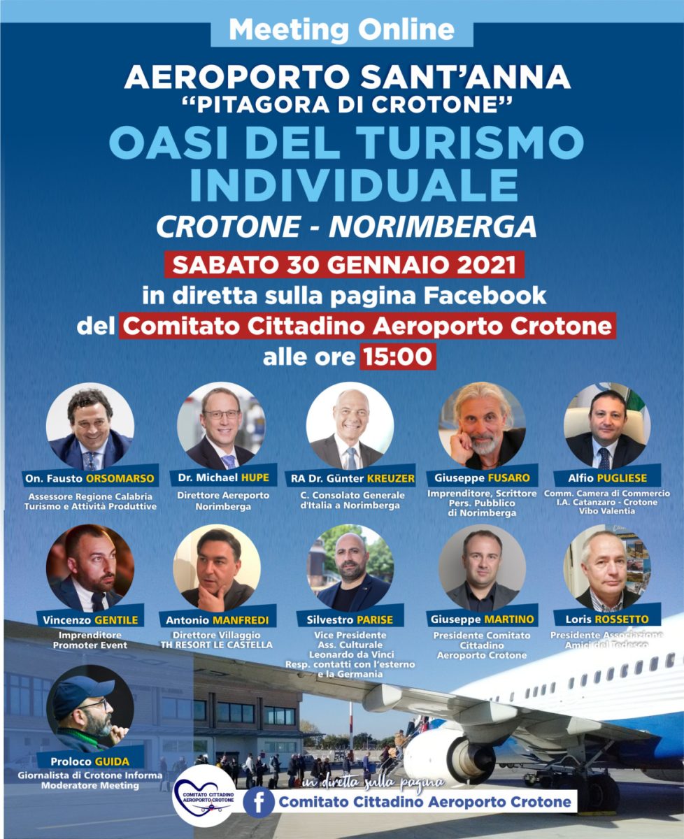 Un evento che può e deve divenire una opportunità di conoscenza e pungolo. Sabato 30 gennaio p.v. alle 15.00 sulla pagina FB del Comitato Cittadino Aeroporto Crotone si svolgerà un meeting per comprendere come e quando si potranno rivedere dei voli da e per Sant’Anna e soprattutto come la storia dell’Aeroporto Pitagora possa trarre spunti programmatici a partire dalle esperienze positive come quelle dei voli da e per Norimberga.