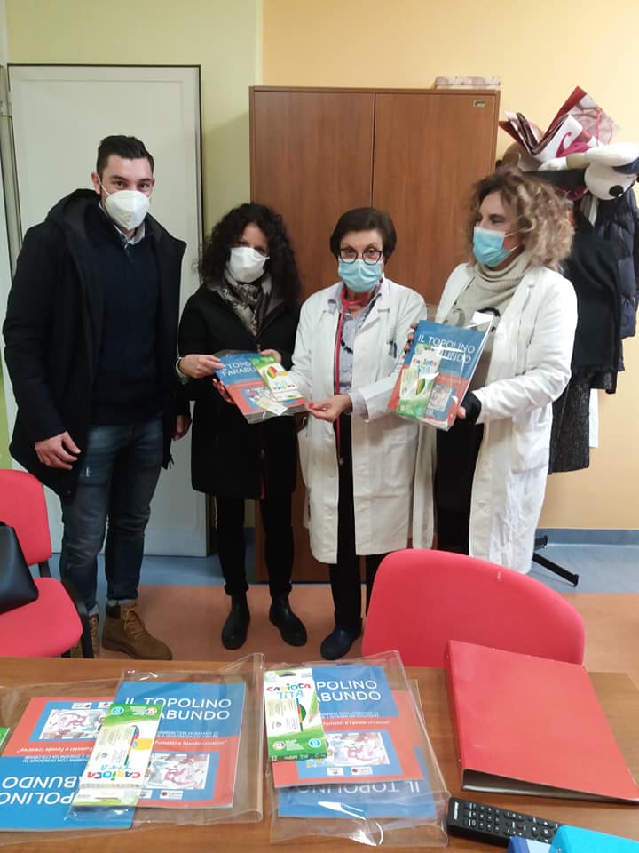 Lunedì 25 gennaio, il presidente della Cooperativa SHALOM Renato Marino e la Coordinatrice del centro diurno “Marianna Agostino” dott.ssa Roberta Megna, hanno omaggiato il reparto di Pediatria dell’ospedale San Giovanni di Dio di Crotone, con alcune copie del libro autoprodotto “IL TOPOLINO FARABUNDO”. Libro nato da un laboratorio interno chiamato “FUMETTI E FAVOLE CREATIVE”, nel quale attraverso spunti creativi suggeriti dagli utenti del Centro, è nata la storia del Topolino Cincirillino e del suo nemico/amico Corvo Masticone. “Abbiamo pensato di donare alcune copie del libro al reparto di pediatria con l’intendo di offrire ai bambini uno strumento piacevole con il quale trascorrere la loro permanenza. Il libro stimola la fantasia, l’attenzione e presenta uno spazio finale per i piccoli lettori dove poter dare vita alla propria creatività disegnando il proprio personaggio preferito”. A nome dei soci della Cooperativa Shalom, si ringrazia il Direttore ff dott.ssa Anastasia Cirisano, l’insegnante Luciana La Vecchia della Scuola ospedaliera reparto Pediatria e tutto il personale.