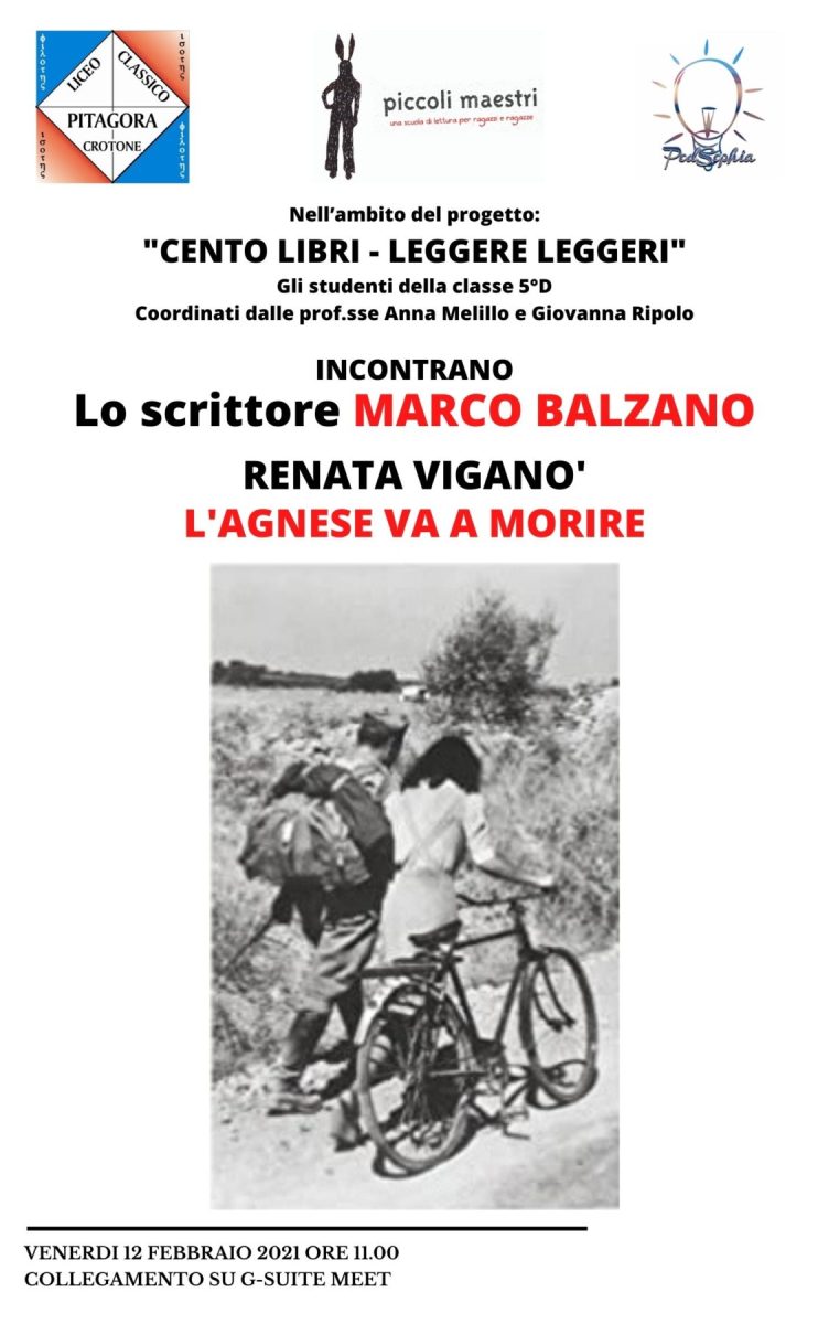 Venerdì 12 febbraio 2021, gli studenti della classe V^D del Liceo Classico “Pitagora” di Crotone, coordinati dalle Prof.sse Giovanna Ripolo e Anna Melillo e introdotti dalla Dirigente Scolastica la prof.ssa Annunziata Galizia e dal segretario dell’Associazione “Piccoli Maestri” Federico Cerminara che con la splendida iniziativa “Cento libri-leggere leggeri” sta portando i classici nelle scuole attraverso la voce di grandi scrittori, hanno avuto l’onore e il piacere di incontrare lo scrittore italiano Marco Balzano.