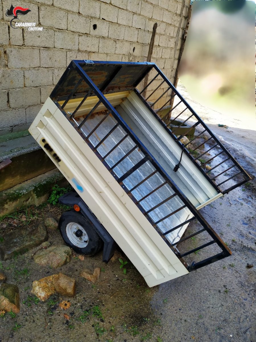 Qualche giorno fa, i Carabinieri dell’Aliquota Radiomobile della Compagnia di Petilia Policastro e della locale Stazione, a seguito di una perquisizione eseguita nell’ambito di un più ampio dispositivo costituito da specifici servizi di contrasto ai reati predatori compiuti nelle campagne dell’interno della Provincia, hanno rinvenuto in un terreno di proprietà di un 49enne del luogo un carrello appendice ed degli attrezzi il cui furto era stato denunciato l’8 febbraio 2021 da un agricoltore presso la Stazione Carabinieri di Petilia Policastro.