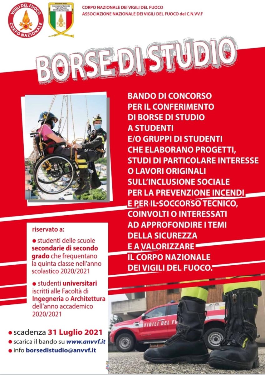 L’Associazione Nazionale dei Vigili del Fuoco del Corpo Nazionale bandisce un concorso per il conferimento di n. 4 (quattro) borse di studio a studenti che abbiano sviluppato percorsi di studio e/o ricerca sui temi della sicurezza inclusiva, così suddivise: