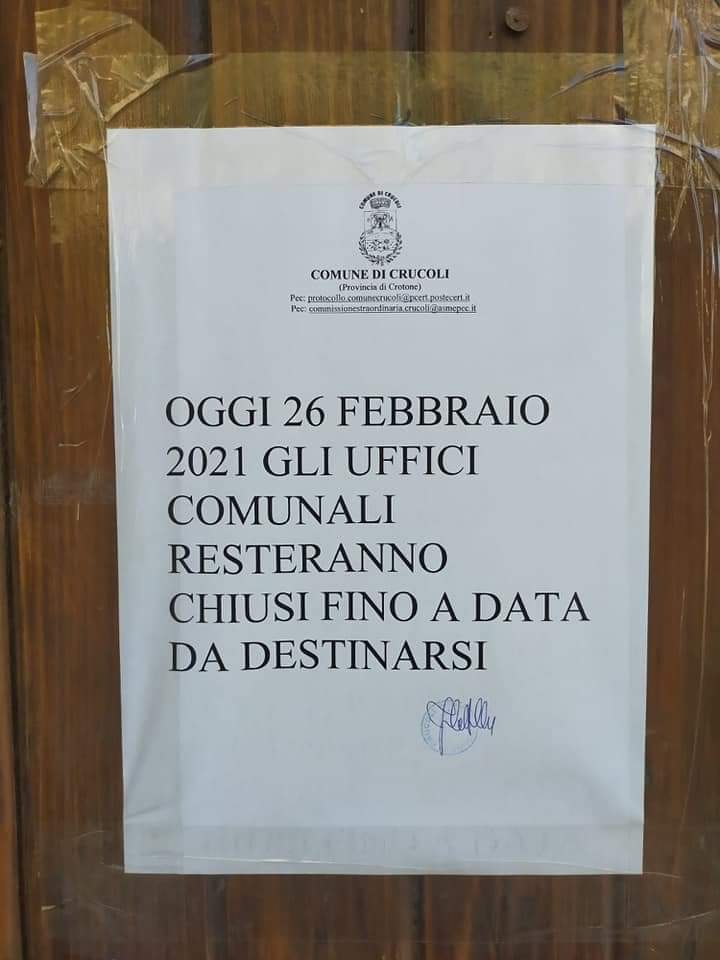 Contemporaneamente, nella mattinata di venerdì, sul portone d’ingresso del Palazzo Municipale di Crucoli è stato affisso un cartello (foto a lato) con il quale si avvisava la cittadinanza che gli Uffici Comunali sarebbero restati chiusi da subito e fino a data da destinarsi.