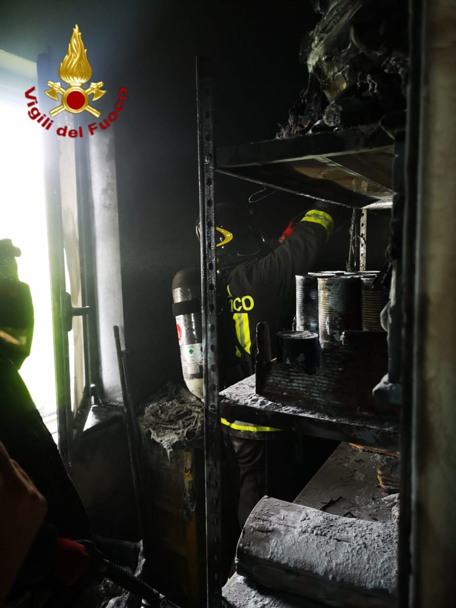 Con autorespiratore personale VF entrava all’interno per eseguire la messa in sicurezza della parte interessata dalle fiamme, nella stessa si notava il soffitto in precario stato di stabilità, quindi veniva eliminata la parte pericolante togliendo anche gli oggetti interessati dalle fiamme staccandoli dalla rete elettrica preventivamente controllata.