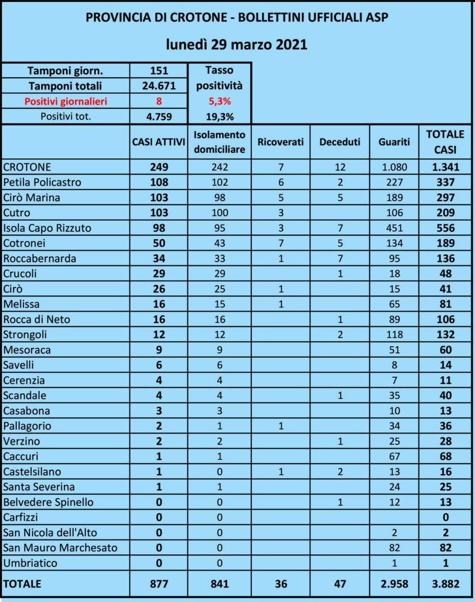 Il bollettino ufficiale dell’Azienda Sanitaria di Crotone, datato 29 marzo, sembra non avere riportato gli incrementi giornalieri dei giorni scorsi, anche perché si tratta dei dati rilevati nelle 24 ore a cavallo tra domenica e lunedì, quindi con un tasso di positività (tamponi positivi su totale effettuati) piuttosto basso, 5,3%, corrispondente a 8 test risultati positivi sui 151 eseguiti in un giorno.