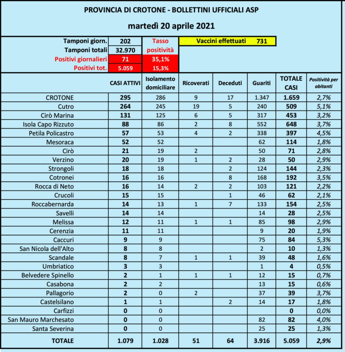 Quanto alla campagna vaccinazione, ieri, nei vari centri vaccinali del territorio crotonese, sono state somministrate 731 dosi (+71 rispetto a lunedì).