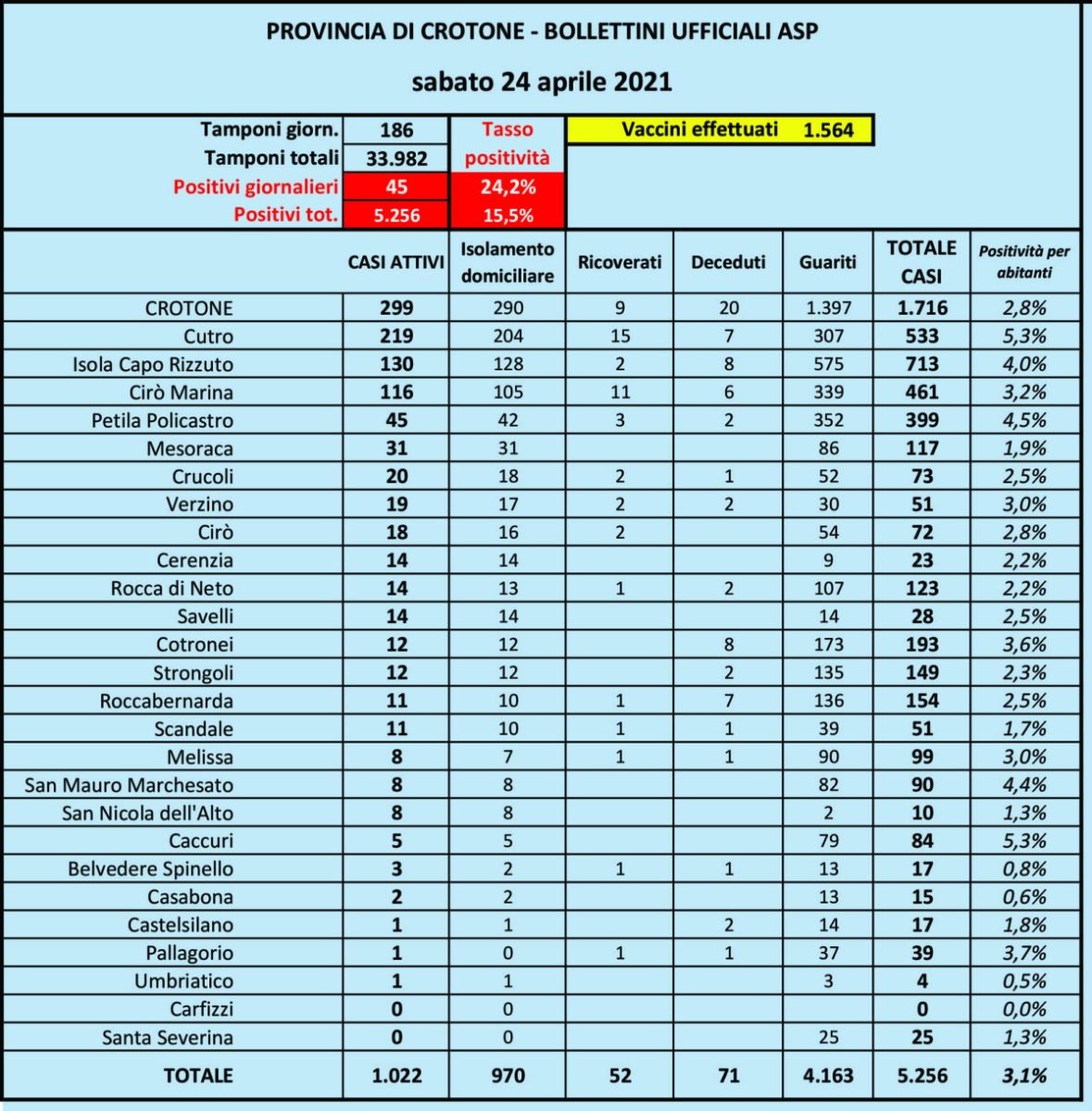 Nel resto dell’alto crotonese nuovi contagi si segnalano a Crucoli (+4), mentre in quasi tutti gli altri comuni della provincia i dati sono in lieve diminuzione.