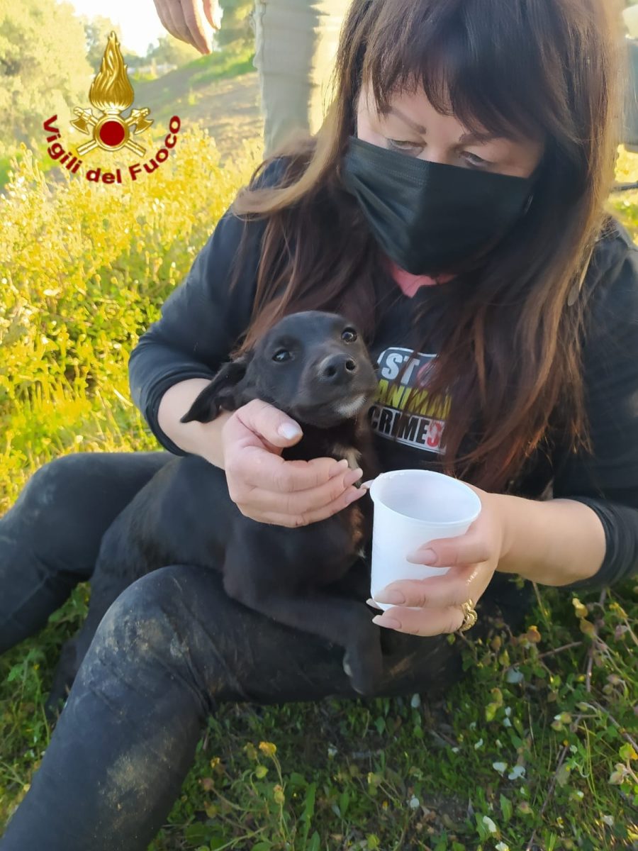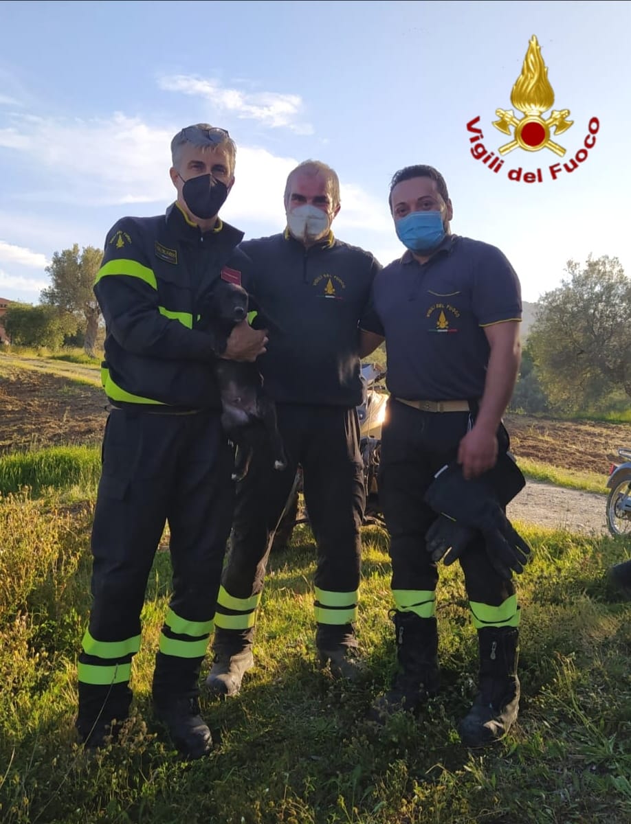 All’arrivo sul posto i vigili del fuoco del distaccamento di Cirò Marina sentivano il lamento del cucciolo in fondo alla lungo canale che rasentava il muro di un deposito per attrezzatura agricola, scavando per oltre un metro con le mani per non ferire l’animale, sono riusciti ad estrarlo da sotto il terreno.