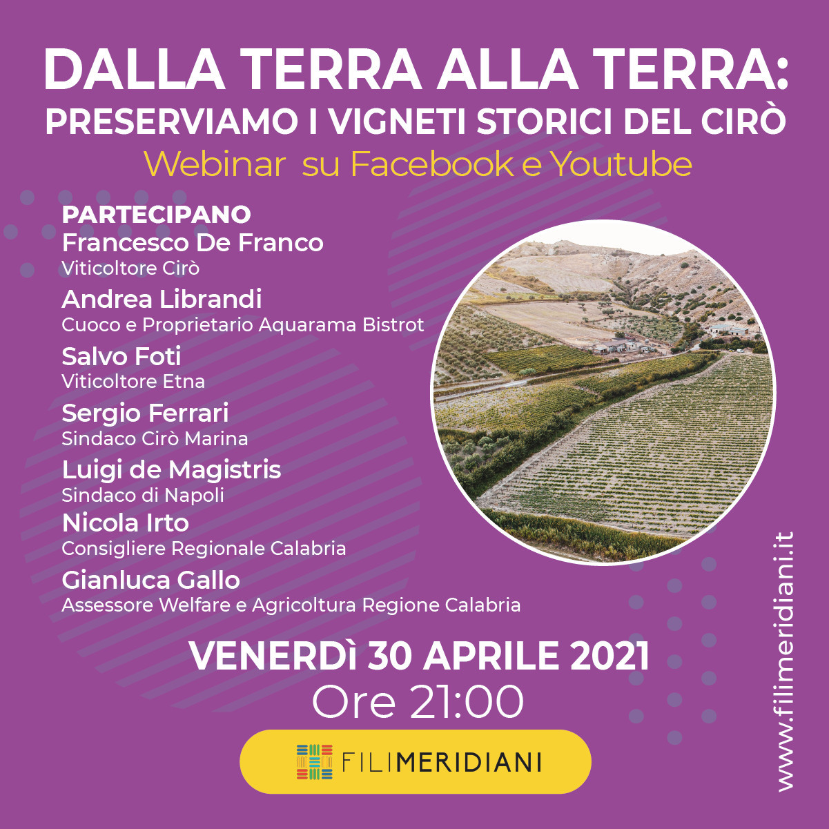 Il 30 aprile alle ore 21:00 l’associazione di promozione sociale Fili Meridiani ha organizzato il webinar “Dalla terra alla Terra: Salviamo le colline del Cirò” su Facebook e Youtube.