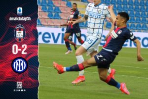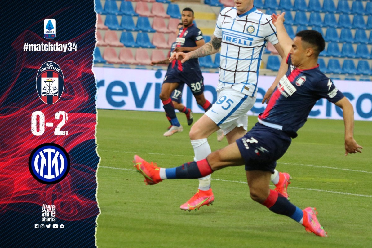 Il Crotone perde in casa contro la capolista Inter e matematicamente retrocede in B. Cosmi rispetto alla vittoriosa trasferta di Parma attua un solo cambio inserendo Benali al posto di Zanellato. Conte invece manda in campo dal primo minuto Darmian e Sensi al posto di Perisic e Eriksen. Avvio subito di marca rossoblù già al primo minuto con Ounas di sinistro, Handanovic respinge in affanno. La risposta degli ospiti è immediata con Sensi (3’) che si ritrova a tu per tu con Cordaz che chiude lo specchio della porta e salva il punteggio. Squali molto propositivi e con Ounas in forma smagliante che mette sempre in pericolo la retroguardia ospite come avviene al 18’ quando raccoglie una spizzata di testa di Simy e carica il sinistro ma il suo tiro viene ribattuto in corner. Al 22’ Darmian ci prova di controbalzo con Djidji che salva sulla linea e sull’angolo successivo è Lukaku a saltare più in alto i tutti e il palo gli nega la gioia del gol. La gara prosegue su ritmi alti e al 28’ è Lautaro a tentare il gran gol con una rovesciata in area ma la palla termina alta. Al 38’ Reca è costretto a lasciare il campo per infortunio ed al suo posto entra Pedro Pereira. Nel finale di tempo la squadra di Conte colpisce un altro palo con Lautaro (44’), sul corner successivo è Messias a salvare sulla linea e al 45’ ci pensa Cordaz a salvare la sua porta con una prodigiosa parata sul tiro ravvicinato di Sensi.