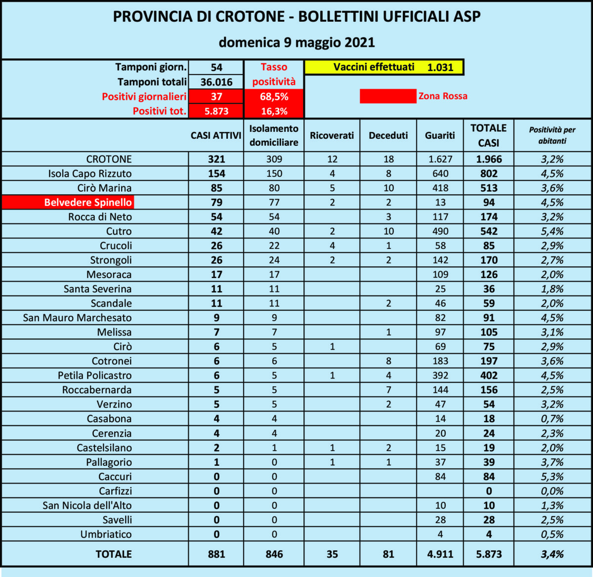 Tornando al nostro ambito crotonese, alcuni focolai territoriali, seppure circoscritti, stanno richiamando l’attenzione degli addetti ai lavori e delle istituzioni: di Belvedere Spinello abbiamo già detto in precedenza, da queste pagine, ma il trend locale continua ad essere in salita, seppur di piccole quantità: dai 74 casi attivi di venerdì si è giunti, alla data di ieri, domenica 9 maggio, a 79, di cui 2 in regime ospedaliero, con un tasso di positività rispetto alla popolazione residente salito al 4,5%, inferiore solo al 5,4 di Cutro, sceso ora a 42 casi, al 5,3 di Caccuri (dove peraltro non ci sono più casi segnalati da diversi giorni), e pari a quello di Isola Capo Rizzuto, Petilia Policastro e San Mauro Marchesato.